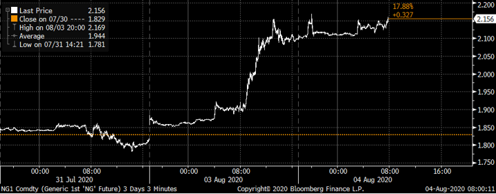 Yesterday, Natural gas price exploded higher after remaining under $2/MMBtu since early May. The combination of warmer weather past the 1-5 days period (indicating that August could follow July’s heat trajectory), LNG jumping near 4 Bcf/d, and production dropping...