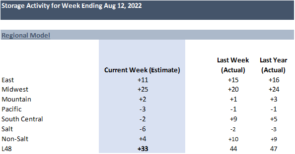 For week ending Aug 12th, the S/D storage model is point to a +25 Bcf injection and flow model is point to a +33 Bcf . The flow model performance has been strong lately, hence we take an average of the two as our final estimate. Our final estimate is +29...