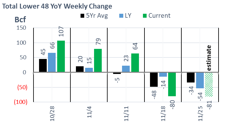 For week ending Nov 25th, our S/D storage model is pointing to a -81 Bcf, while our flow model is lower at -78 draw. Last year we drew only -54 Bcf during the same week.