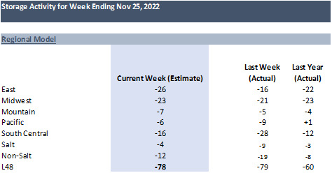 For week ending Nov 25th, our S/D storage model is pointing to a -81 Bcf, while our flow model is lower at -78 injection.