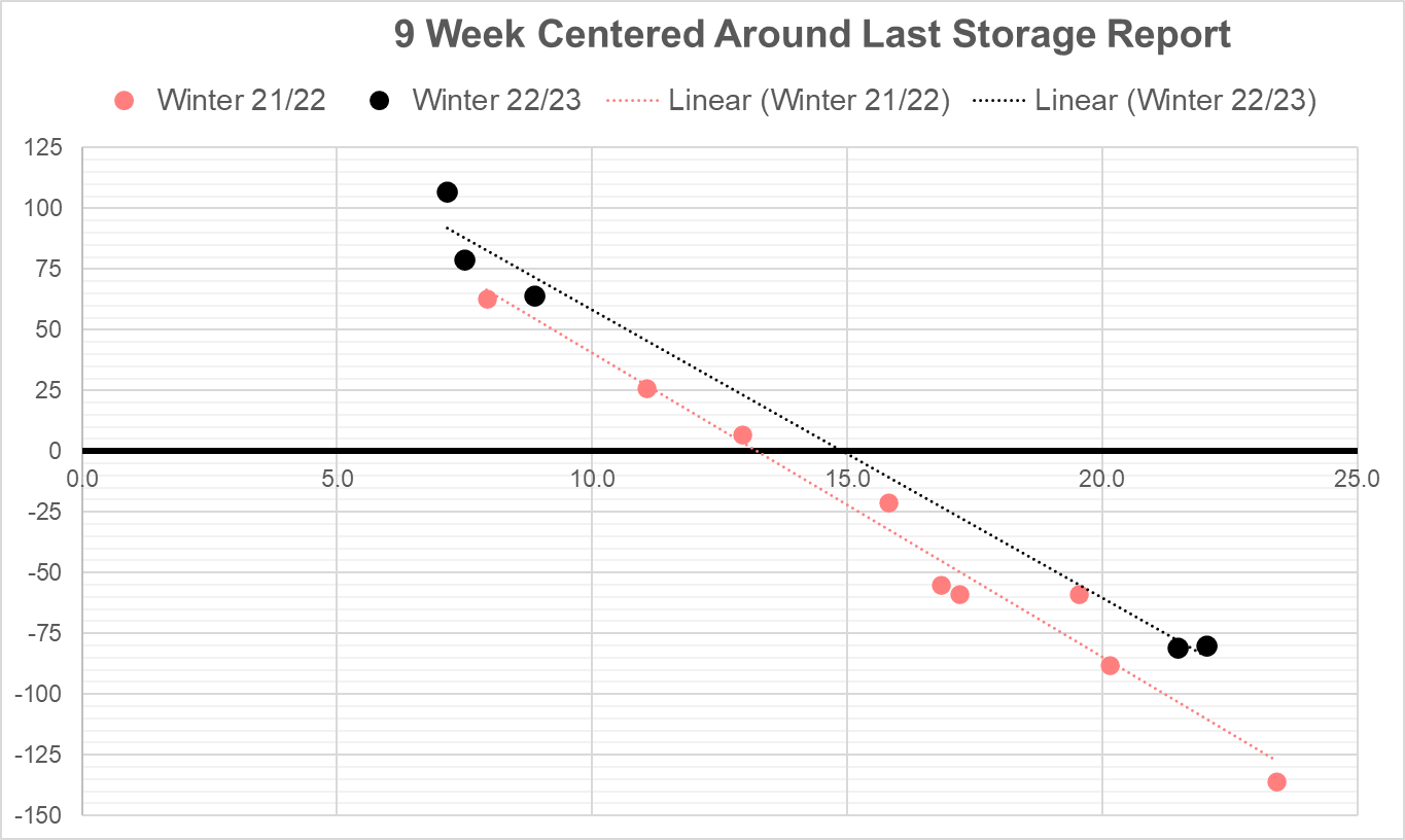 This past report continues to be loose relative to LY. We peg this report at being +3.1 Bcf/d loose (wx-adjusted).