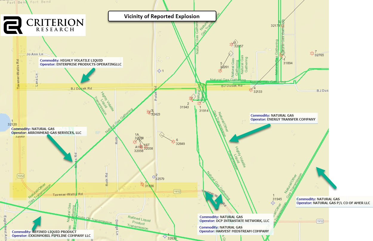 Daily US natural gas production is estimated to be 96.5 Bcf/d this morning. Today’s estimated production is +0.1 Bcf/d to yesterday, and -0.42 Bcf/d to the 7D average. The Fort Bend County ET pipeline explosion does not look to have impacted production. The explosion was officially reported as the Old Ocean Pipeline, which brings Permian supply down from Central Texas towards the Gulf Coast. That pipeline has a capacity of 160 Mmcf/d, and the outage could impact intrastate Permian Basin production receipts while offline. We see no evidence of that yet. Below is a good map from Criterion Research.