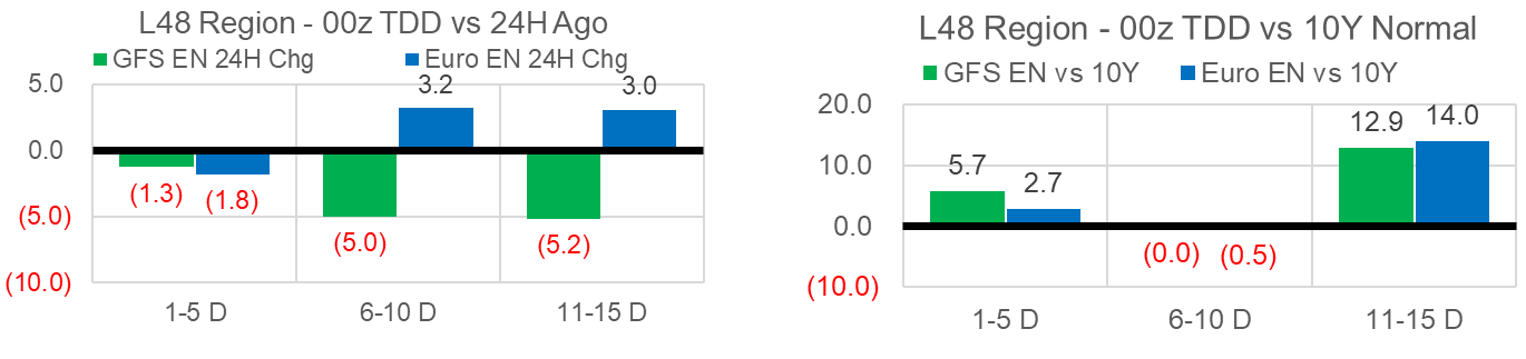 The GFS Ensemble warmed started next week to bring it in closer alignment with the Euro Ensemble. Here are the overnight changes in the models that are resulting in temps hovering close to the 10Y for 1-5 and 6-10 day periods, after which temps start to cool.