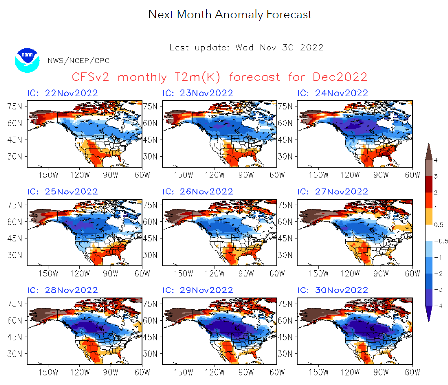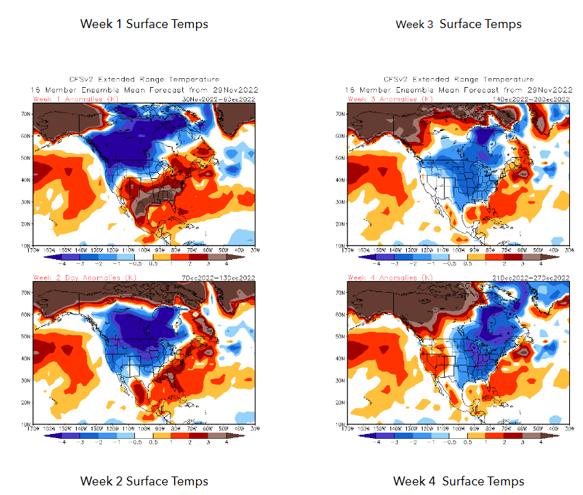 The CFVv2 forecast are pushing cool temps in to the Dec forecast. Here is a view of week 1-4:
