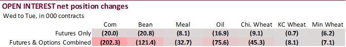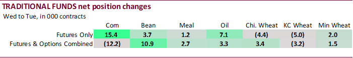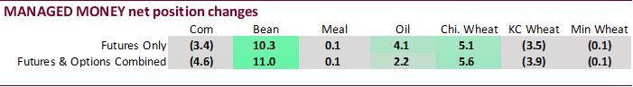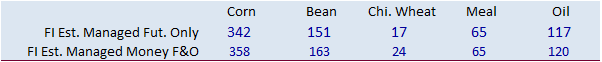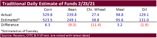 Not too many surprises like last week when it came to actual readings for the CFTC Commitment of Traders report. Funds were less long for soybeans and wheat and more long for corn and soybean meal. Soybean oil was near expectations. What remains is that both traditional funds and managed money are both very long. Changes in futures only versus futures and options combined did not line up for corn and soybeans, a hint option trading dominated some of the volume for the week ending February 23.