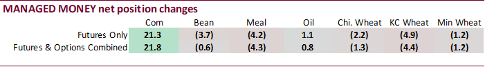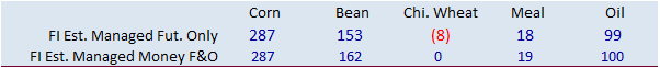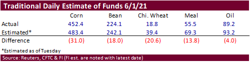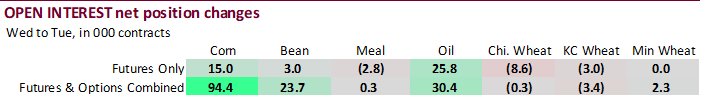 Funds were less long than estimated for the 5 major CBOT commodities we follow on a daily basis, bit don’t see any price reaction from the positions as prices were back and forth Tuesday through Thursday before rallying Friday. Traditional funds and money managers added to their net long position in corn for the week ending 6/1, while decreased their net long positions for the soybean complex, by a small amount. Note for futures and options combined, open interest in corn was up sharply by 94,400 contracts while futures only open interest rose 15,000. Last week into Tuesday, corn option volume was heavy for a few of those days.