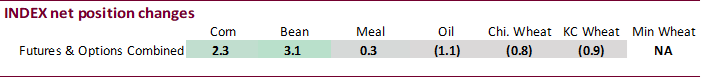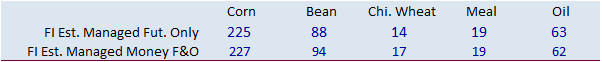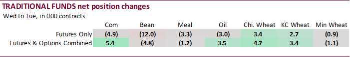 Position changes for traditional funds and managed money for the major ag markets were minor. Funds were more long than expected for corn and wheat, and slightly less long than expected for soybeans.