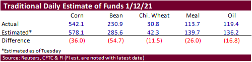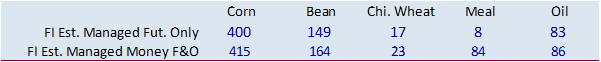 on Friday sold an estimated net 12,000 soybeans, sold 1,000 soybean meal and sold 12,000 soybean oil.