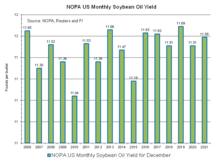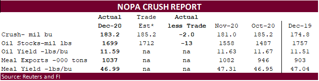 December crush was reported 2 million bushes below a trade guess at 183.2 million bushels and soybean oil stocks came in at 1.699 billion, 13 million below an average trade guess. Note the soybean oil yield and soybean meal yield was lowered form the previous