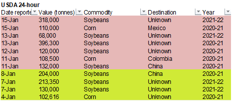 the 24-hour USDA reporting system, private exporters reported export sales of 318,000 tons of soybeans for delivery to unknown destinations during the 2021-22 marketing year.