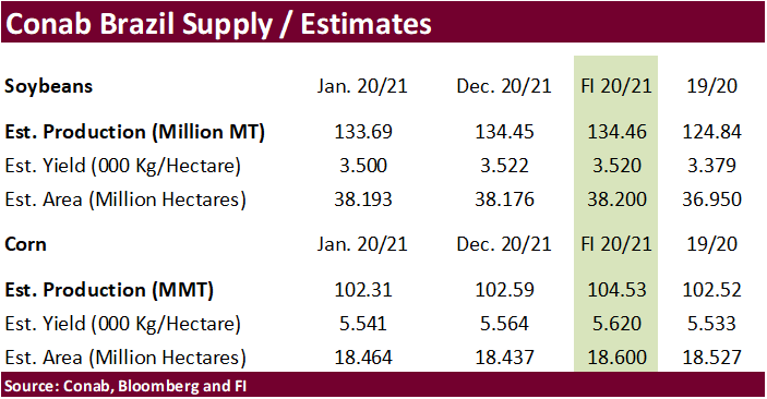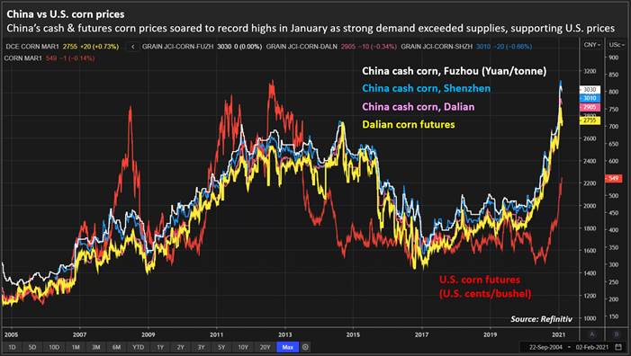 - Reuters noted (commercial) stocks of corn held by Chinese feed makers and other end users reached multi-year highs in some areas, and indication of stockpiling amid concerns over future shortages. Local corn prices increased 50% higher during 2020.