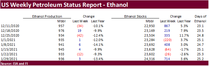 - US weekly ethanol production increased 3,000 barrels per day to 936,000 barrels and stocks increased 714,000 barrels to 24.318 million, largest since May 1, 2020.