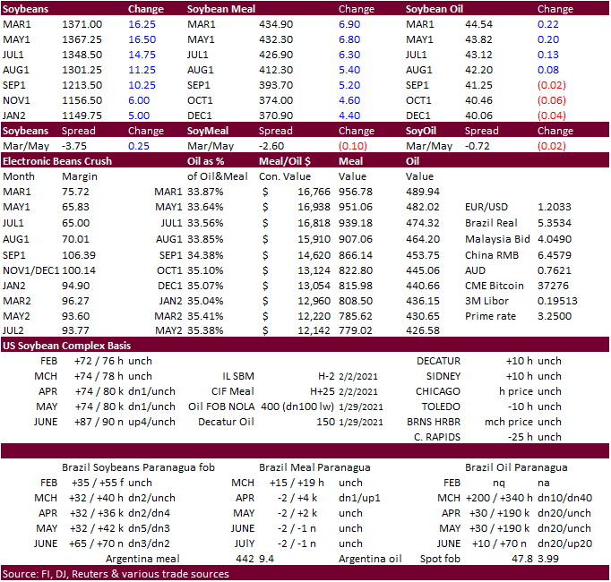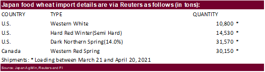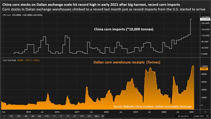 - Reuters noted (commercial) stocks of corn held by Chinese feed makers and other end users reached multi-year highs in some areas, and indication of stockpiling amid concerns over future shortages. Local corn prices increased 50% higher during 2020.