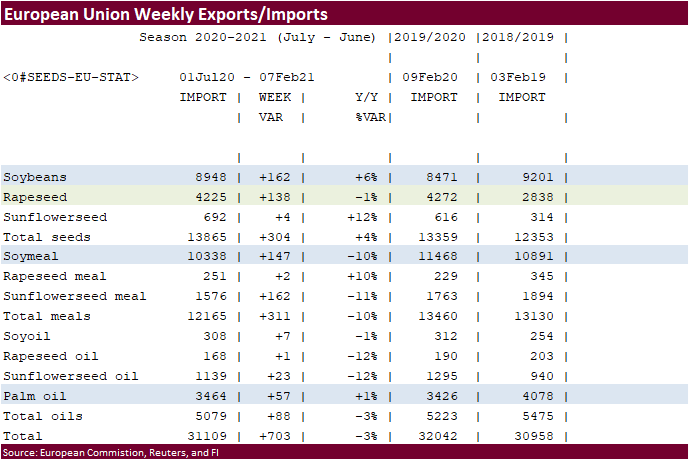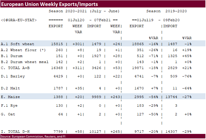 European Union granted imports licenses for 20,000 tons of corn imports, bringing cumulative 2020-21 imports to 9.989 MMT, 27 percent below same period year ago