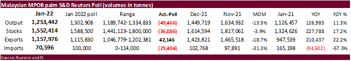 · The Malaysian Palm Oil Board reported end of January stocks at 1.552 million tons, 36,000 tons below an average trade guess and down from December. Stocks are at a 6-month low. December stocks were upward revised 32,000 tons. Palm production during January slowed more than expected. Exports were higher than expected at 1.158 MMT, but well below 1.424 MMT exported during December. Traders are looking for February daily adjusted exports to improve but that has yet to be seen.