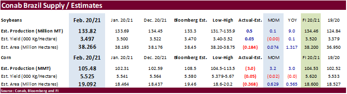 estimated the Brazil total grain crop was seen at 268.3 million tons, up from 264.8 million tons in Jan and above 257 million tons in 2019-20.