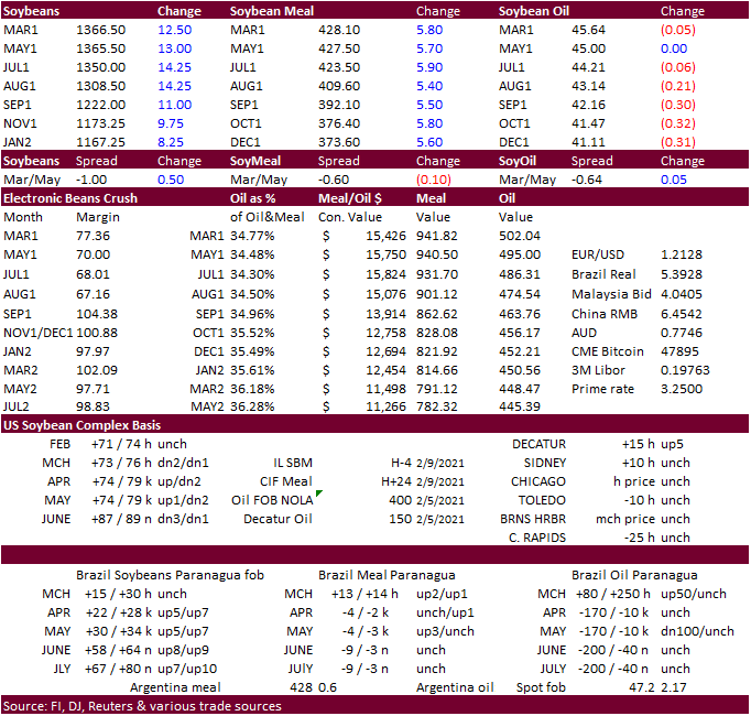 grains exchange raised its forecast for the 2020-21 Argentina soybean harvest to 49 million tons, versus 47 million previously, and for corn to 48.5 million tons from 46 million, due to recent rains improving conditions. USDA is at 48.0 million tons for soybeans