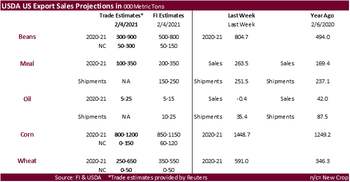 light. Some traders were waiting out to see what the extent of the damage had from the recent US cold temperatures and heavy snow prompting reports of forces majeures for exports. We are hearing US logistic problems started easing yesterday. USDA export
