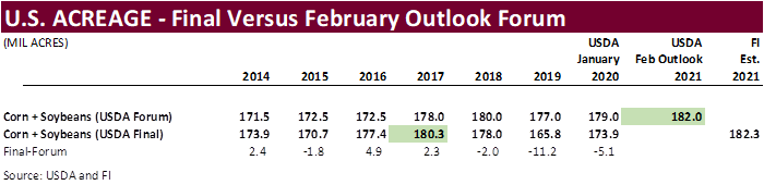 92 million acres USDA projected for the US corn crop was the only figure that initially stood out this morning in USDA’s “2021 Agricultural Economic & Foreign Trade Outlook” speech, as it came in below trade expectations. But combining soybeans (90.0), the