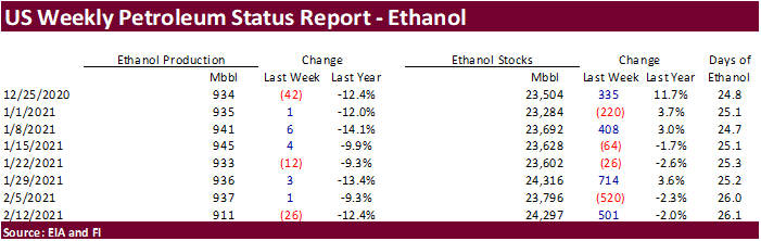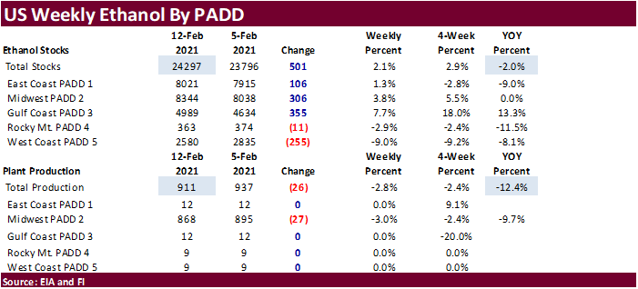 last week was off 26,000 barrels to 911,000 barrels (trade was looking down 17,000) and stocks were up 501,000 barrels to 24. (trade 48,000 increase) from the previous week. Ethanol production was lowest since September 25. Stocks are at a three-week high.