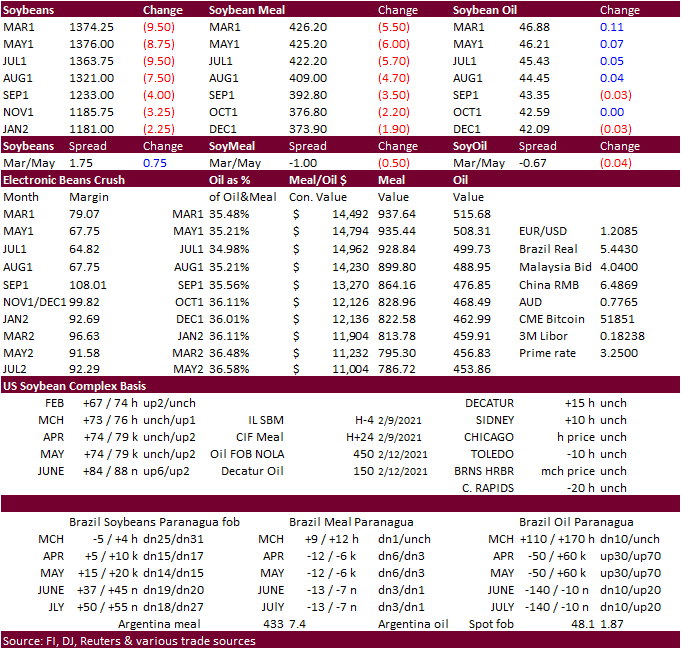 futures ended mostly lower in part to bear spreading in soybeans. Less than expected 92 million area US corn planting outlook for 2021 (92.9 Reuters guess) did little to stop overall selling but in the end may have influenced late bear spreading. News was