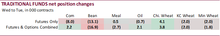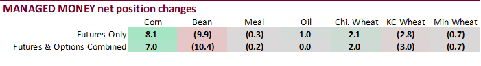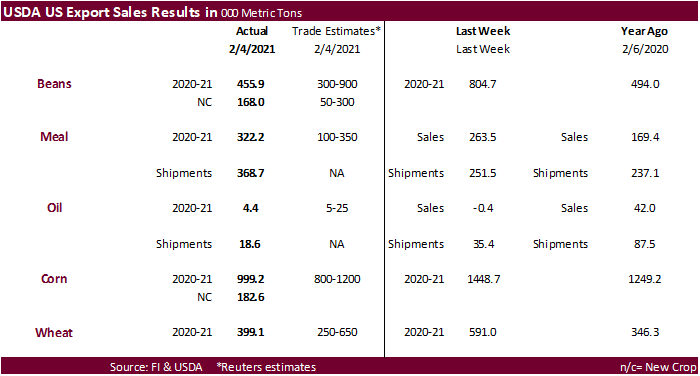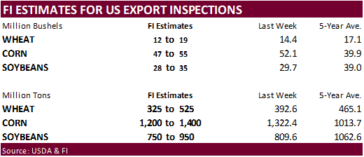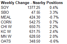 were within expectations for soybeans and meal and below for soybean oil. China bought a new-crop soybean cargo. Soybean meal shipments were good and a marketing-year high with destinations primarily to Colombia (62,400 MT), the Philippines (50,800 MT),