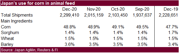 Vietnam (48,600 MT), Italy (46,300 MT), and Denmark (33,000 MT). USDA sales for corn of 999,200 tons for this crop year and 182,600 tons for new crop were within expectations. Mexico and Costa Rica were largest countries for 2020-21 and 2021-22. Sorghum