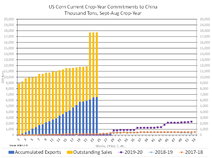 was some talk China may roll some of their US corn commitments into new-crop. There are 6.5 million tons (MMT) accumulated (shipped) and 11.1MMT outstanding. China US corn commitments (17.7MMT) make up 30 percent of the total US commitments (58.6MMT). Unknown