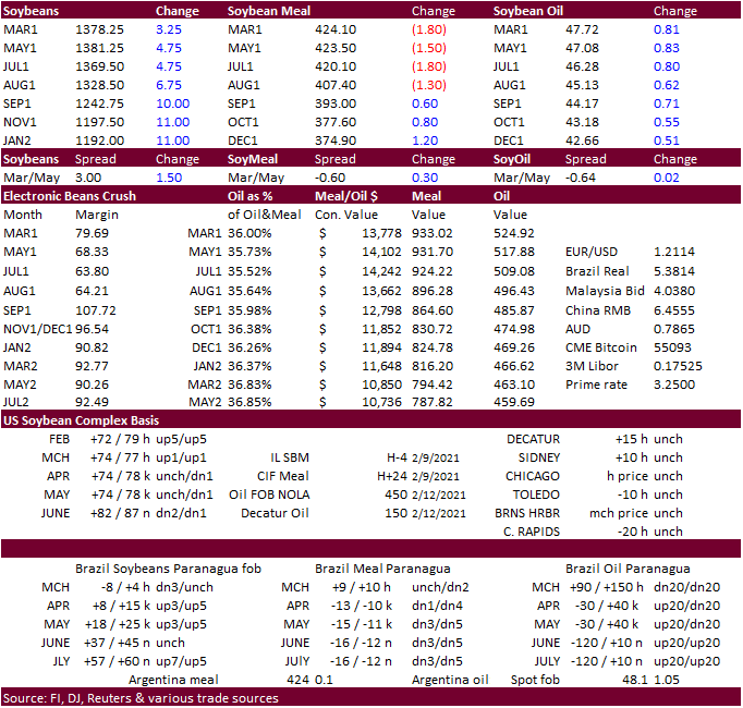 were within expectations for soybeans and meal and below for soybean oil. China bought a new-crop soybean cargo. Soybean meal shipments were good and a marketing-year high with destinations primarily to Colombia (62,400 MT), the Philippines (50,800 MT),