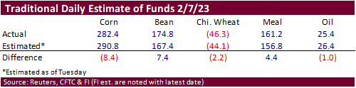 Funds bought an estimated net 5,000 soybeans, 5,000 soybean meal and sold 3,000 soybean oil.
