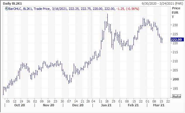 May milling wheat (down 6 sessions) was down 1.00 at 222 euros. - Selected