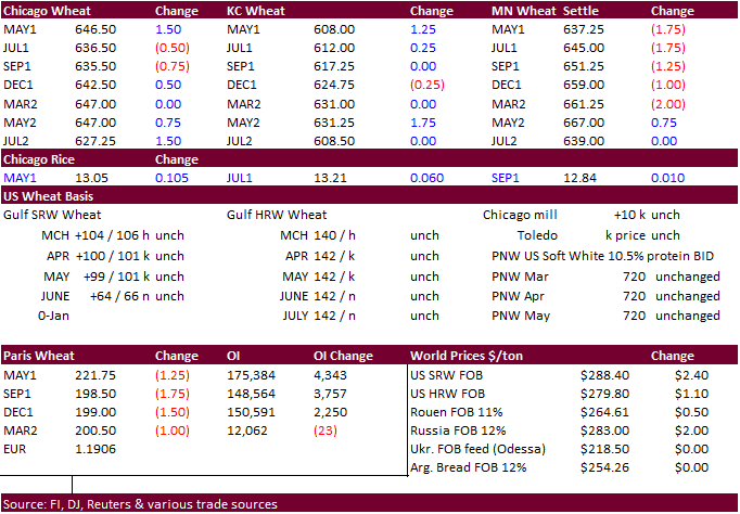 wheat futures traded two-sided, ending unchanged to slightly higher in Chicago & KC and mostly lower in MN. KS and OK winter wheat conditions saw an improvement from the previous week after the US saw a great rain event late last week. EU wheat hit a one