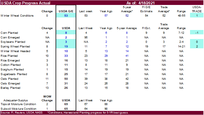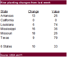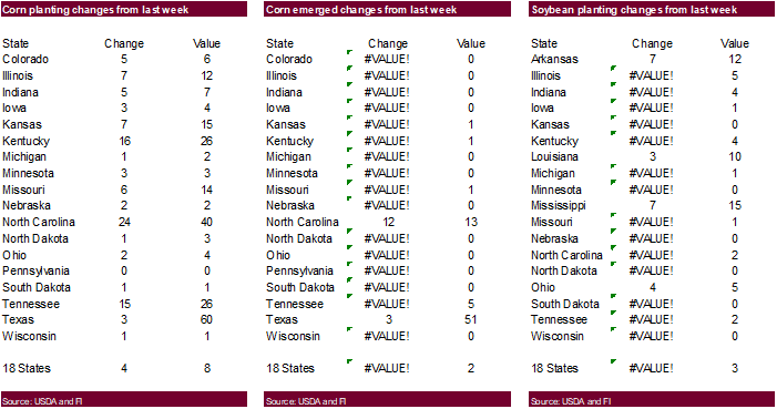 conditions were unchanged from the previous week and planting progress was slow for corn & cotton. Soybean planting progress was as expected.