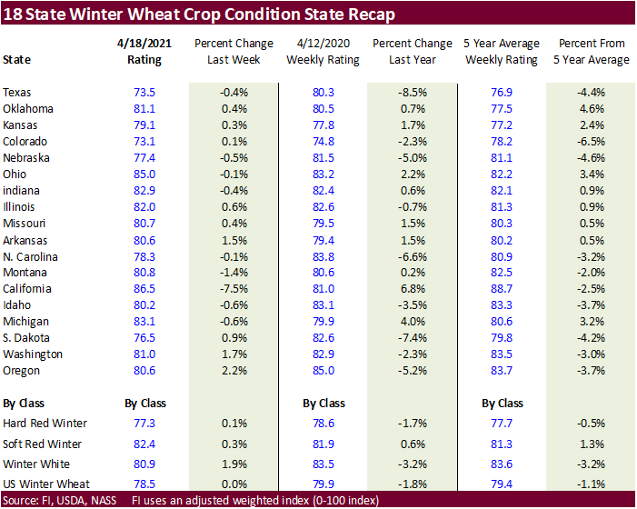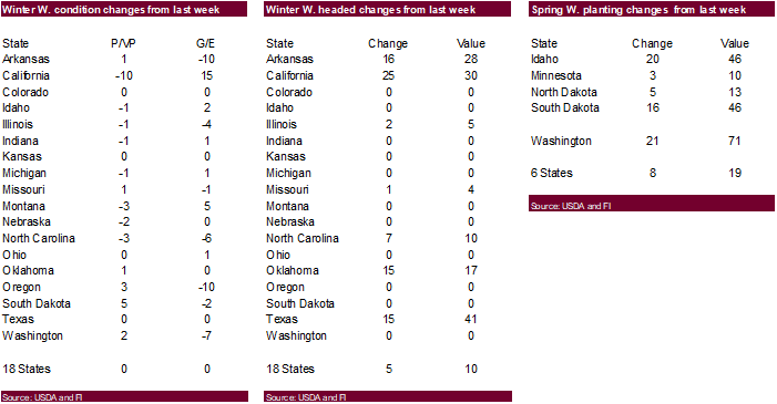 damage to jointing and booting wheat in West Texas is possible, but the impact on the nation’s total production should be quite low - Most