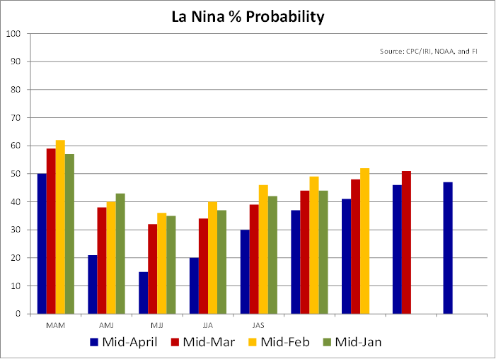 Weather, Inc. still sees the monsoon ending by the end of this month limiting rainfall for May and raising the potential for threats to production. For areas not receiving much rain the soil will be drying out and with topsoil moisture already rated short