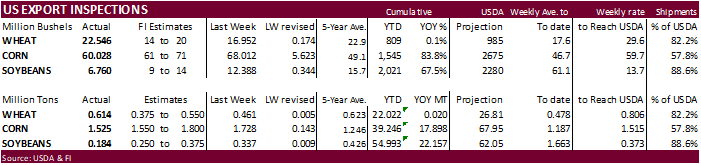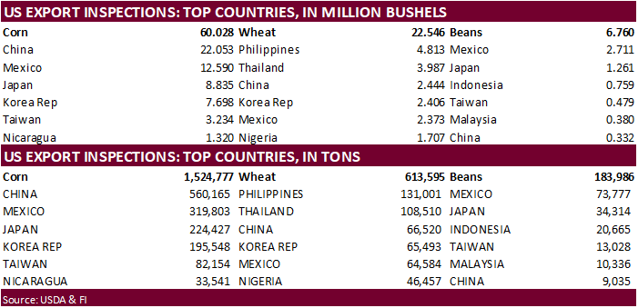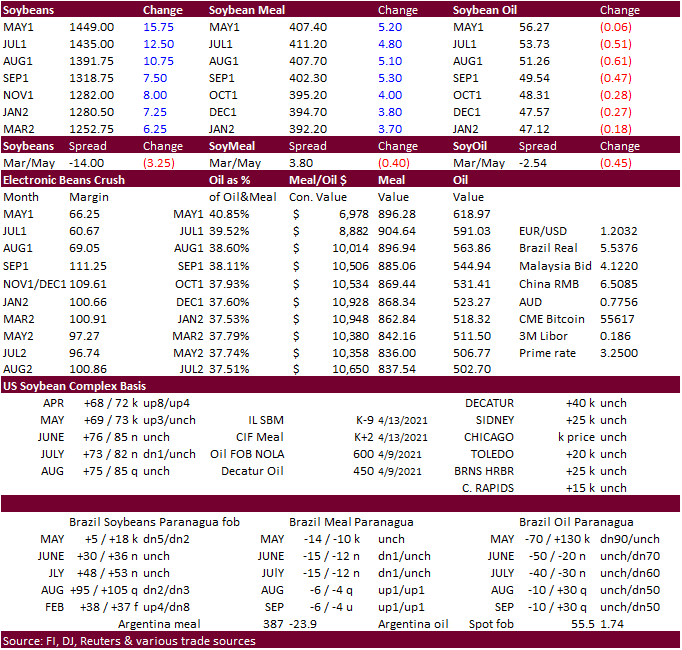 US soybean complex tables are attached. Brazil and US weather concerns supported corn, soybeans and most wheat contracts. SBO fell due to a reversal in product spreading amid weaker offshore values. $14.60 is not out of reach for nearby soybeans. US wheat