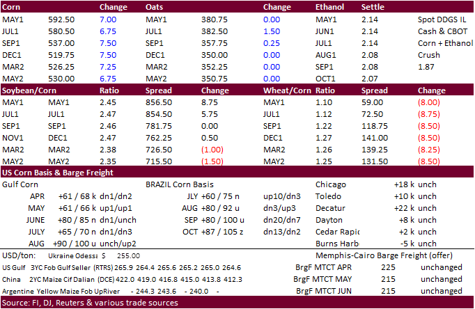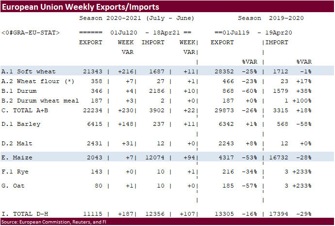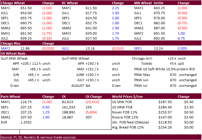 Russian wheat export prices rose $1.00/ton to $248/ton (April) from the previous week.