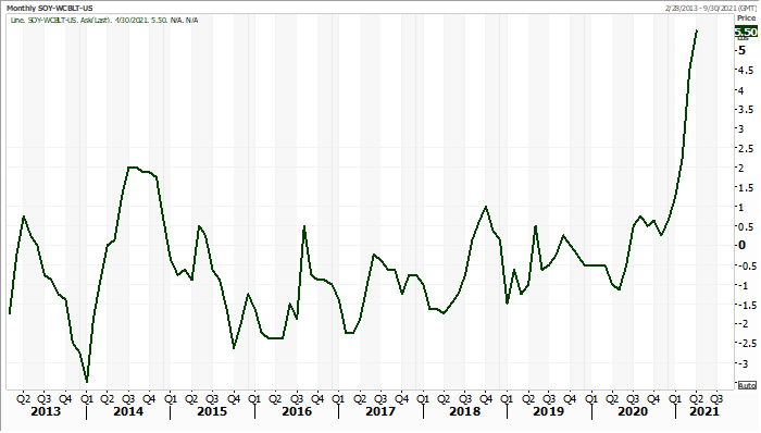 oil basis (high end) rose last week to levels not seen for years. As of Friday, IL soybean oil basis was around 700 over, up from 450 previous week, ECB 1000 over (up from 475 previous week) and WCB indicative 2000 over, up from 1000. Gulf is around 600