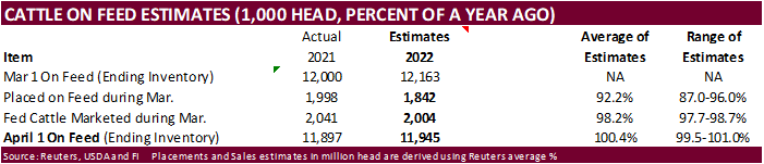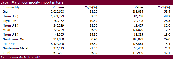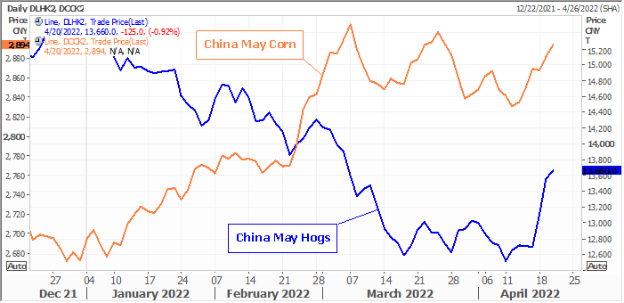 China Jan-March corn imports were 6.73 million tons. March corn imports from the US were 1.04 million tons, near year ago levels. They took in 1.36 million tons of Ukraine corn (sailed before the conflict), up 64 percent from