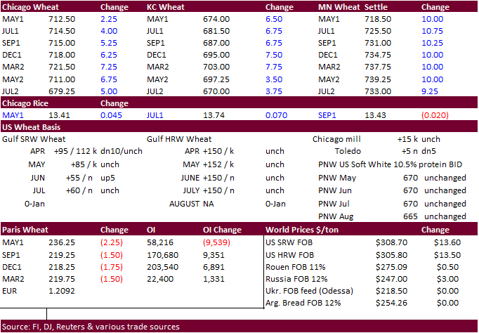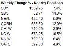 were lower Friday with exception of MN, then prices traded choppy to end higher led by MN contracts. Chicago wheat hit its highest level since 2014. A less than expected reduction in French wheat ratings didn’t seem to put much pressure on the main global