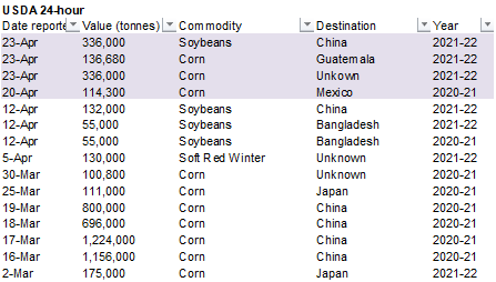 sales of 336,000 metric tons of corn for delivery to unknown destinations during the 2021/2022 marketing year; -