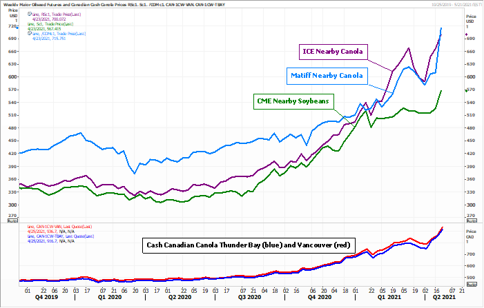 rapeseed vs. Canadian canola and CBOT soybeans, in USD/ton