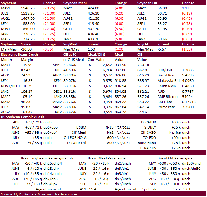 basis May ended 19.25 cents higher after hitting their highest level since 2013. The back months for soybeans followed May lower. May SBO was up 124 points (hit a 2008 high) but the back months settled lower (July down 1 point & Aug down 8 & Dec down 68