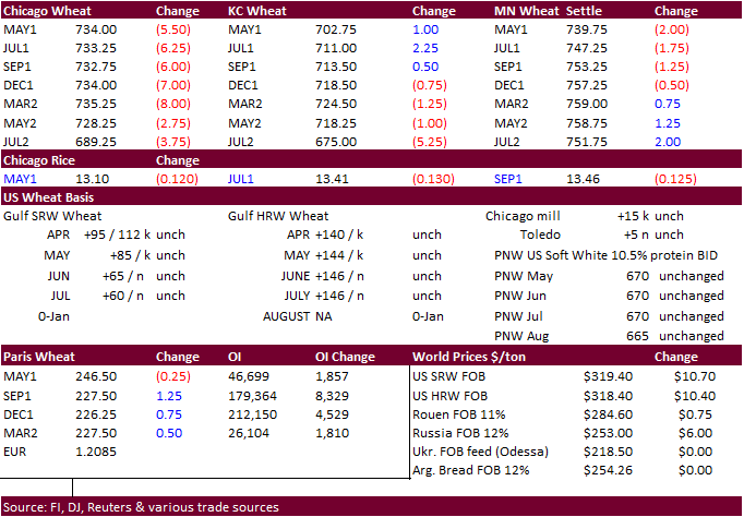 wheat futures were higher to start but turned south shortly after corn broke. Some traders took profits after prices were hovering around 2013 highs. The rest of the session was a very choppy and Chicago ended 1.75-5.75 cents lower, KC mostly 0.25-2.50 cents
