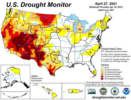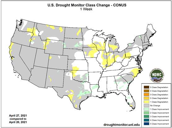 US Drought Monitor as of April 27, percent of crop areas experiencing drought vs. previous week: