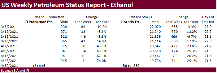 Bloomberg poll looks for weekly US ethanol production to be up 9,000 barrels (949-965 range) from the previous week and stocks down 12,000 barrels to 19.724 million.
