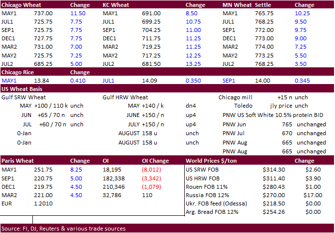 wheat ended higher led by KC type wheat on strength in corn. KC type wheat conditions slightly declined from the previous week while white and SRW wheat improved. The US precipitation forecast calls for net drying across parts of the US Great Plains over