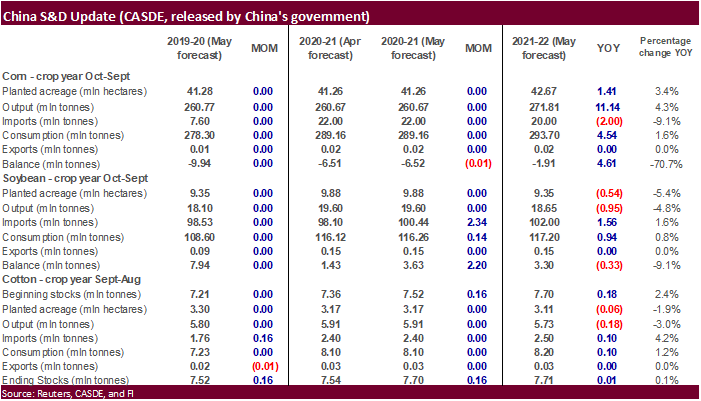 in their monthly S&D update, estimated new-crop (2021-22) imports for soybeans at 102 million tons (+2 YOY) and corn at 20 million tons (-2MMT YOY).