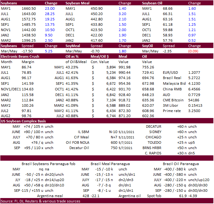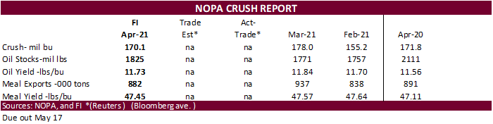 report triggered a negative reaction for feedgrains and supportive for oilseeds. Brazil’s Conab reported a higher than expected 2020-21 corn production estimate. China, in their monthly S&D update, estimated new-crop (2021-22) imports for soybeans at 102
