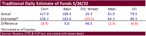 Expect good US Midwest plantings next week, similar to the past week as we predict for the upcoming USDA crop progress released Tuesday afternoon, per US holiday. Opening calls look for Monday night look unchanged to higher per global inflationary measures,